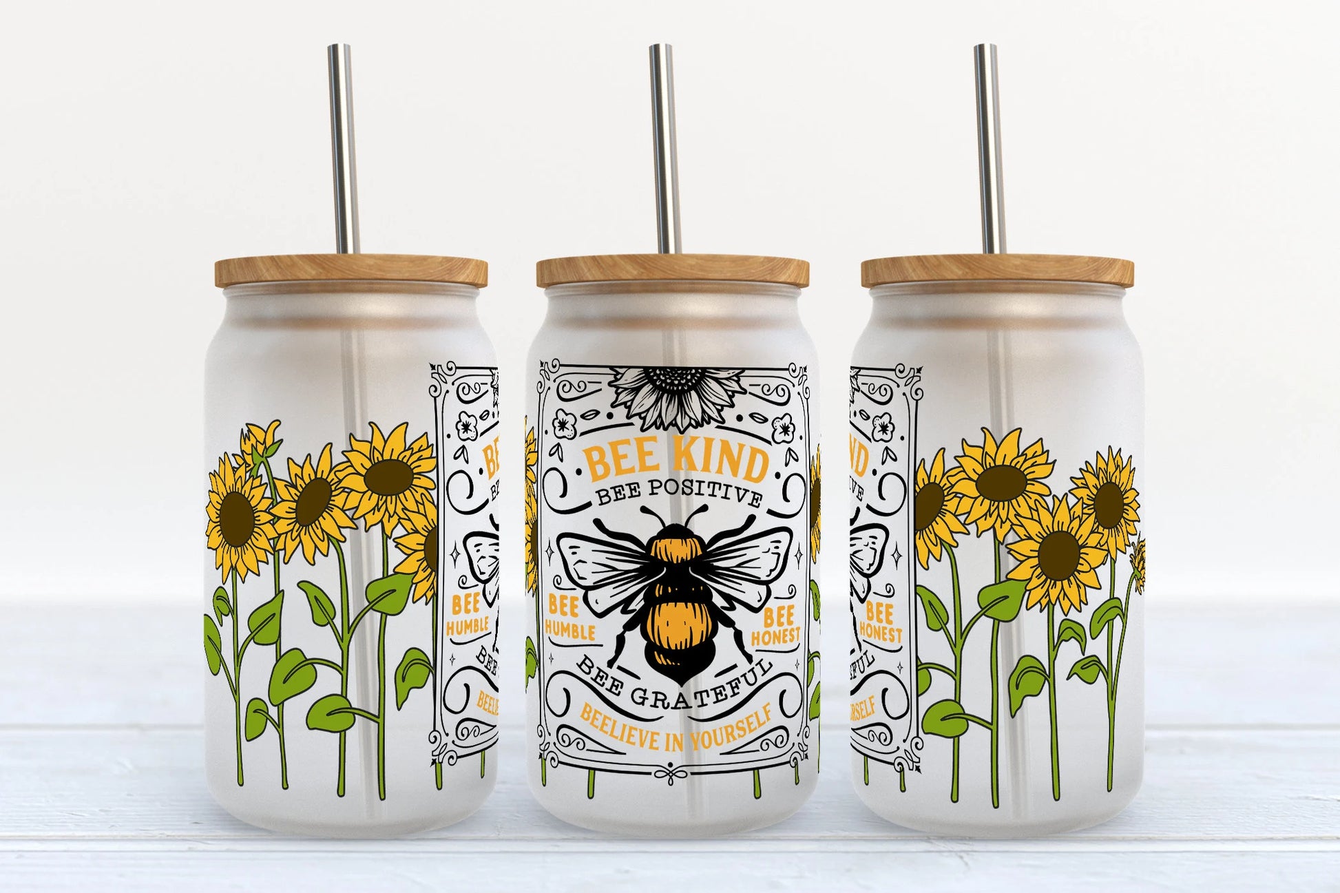 Libby Beer Glass Can Cup Sunflowers and Bees - Bee Kind Bee Positive Coffee Lover Gift - Frosted or Clear Glass Cup | Funny Gift Idea